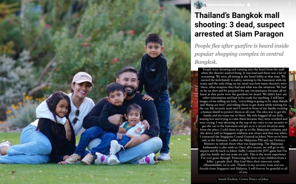 Tunku Mahkota Johor (TMJ), Tunku Ismail Idris ibni Sultan Ibrahim had the scare of his life when gunshots and screaming were heard from Siam Paragon, the mall right next to their hotel. The Crown Prince of Johor later described it as “the worst experience I’ve ever gone through“.
