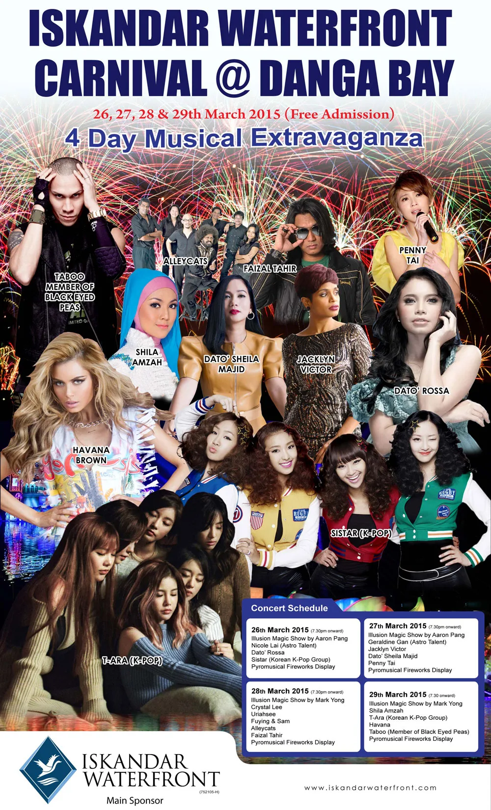 In collaboration with Iskandar Waterfront Holdings Sdn Bhd (IWH), State Tourism, Trade and Consumerism Committee chairman Datuk Tee Siew Kiong said the Johor Tourism Department will organise a 4-day open-air concerts at Danga Bay beginning 26th March. Tee said that 50,000 people are expected to attend the music festival that would feature both international and local artistes including Taboo of Black Eyed Peas, SISTAR, T-Ara, Fuying & Sam, Rossa, Sheila Majid, Jacklyn Victor, Shila Amzah, Penny Tai, Alley Cats, and many more.
