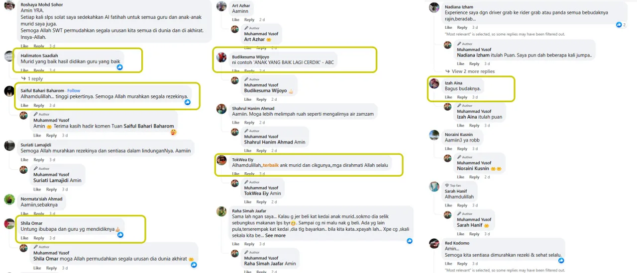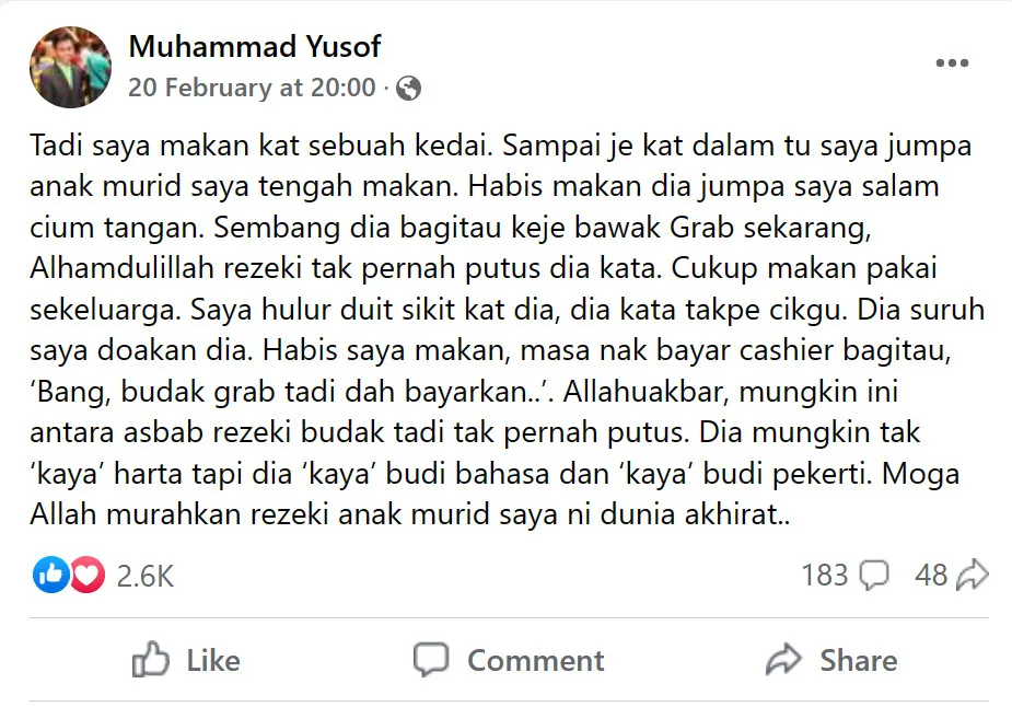 The educator from Johor further revealed that he offered his student some money. However, the young man surprisingly turn it down. “I handed him some cash, and he said, ‘It’s fine, Sir.’ He only asked that I pray for him. After finishing my meal, I was informed by the cashier that the Grab rider had paid for my meal. He may not be wealthy, but has a good character. May God bless my student in this life and the hereafter,” he concluded his post.