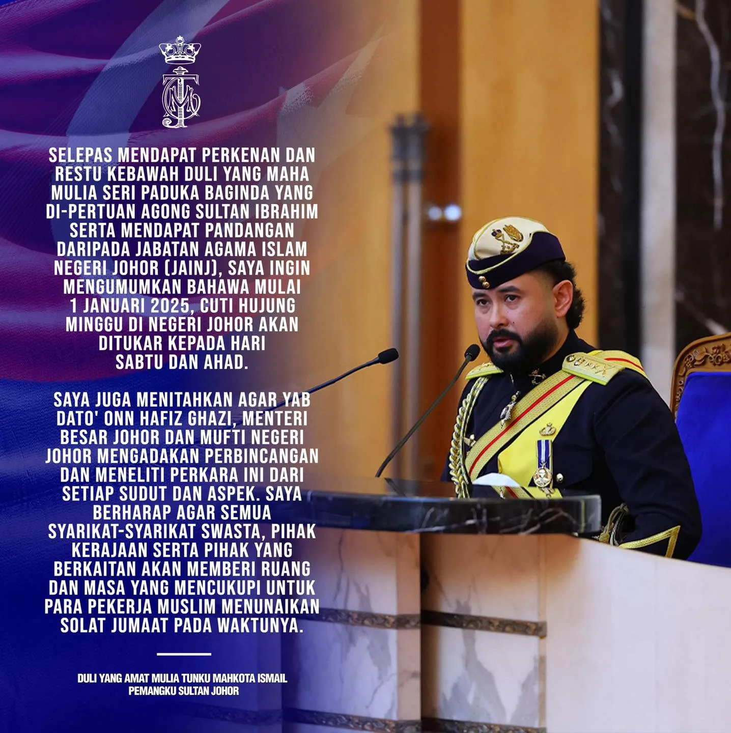 It has been stated that the decision regarding the weekend changes was made after the consent and blessing from His Majesty Sultan Ibrahim, King of Malaysia, and the views of the Johor Islamic Religious Council (JAINJ). The new weekend change will be in use, beginning next year, on 1st January 2025.
