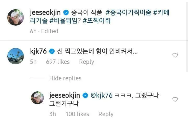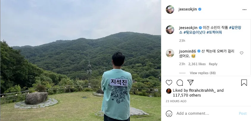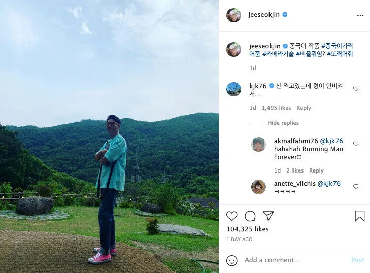 In response, the hunky singer wrote in the comments, “I was taking a photo of the mountain but you didn’t move…” to which Ji Suk Jin replied, “Lol. Oh, I see. So that was it.” So Min also chimed in, “I was taking photos of the mountain but you keep getting in my frame.” Ji Suk Jin replied to Jeon So Min, saying, “Lol. Oh, you too, I see. Of course, that was it.”