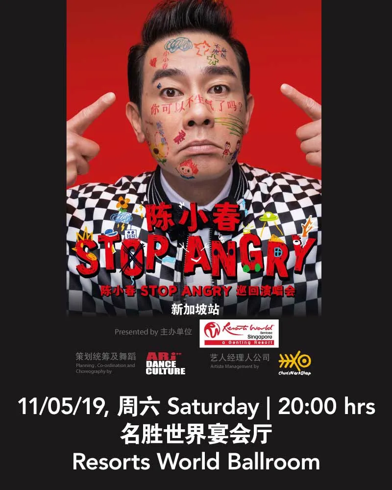 Jordan Chan “Stop Angry” Concert 2019 will take place on 11th May 2019 on 8pm at Resorts World Convention Centre in Resorts World Sentosa.