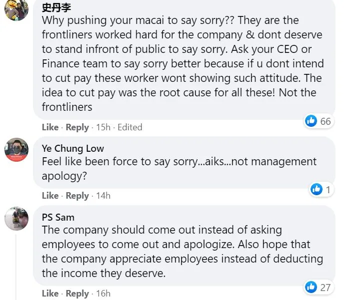 There were also demands for the upper management to apologise, not just the workers. Some commented that the apology was forced by the management.
