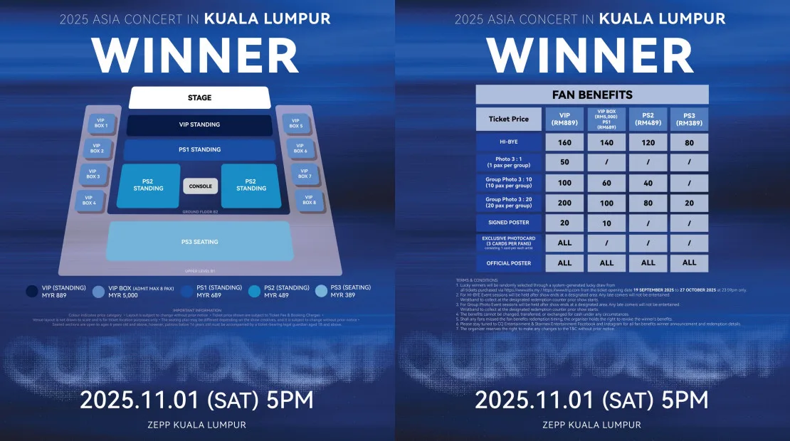 - Ticketing: RM5000 (VIP BOX – 8pax), RM889 (VIP – STANDING), RM689 (PS1- STANDING), RM489 (PS2 – STANDING), RM389 (PS3 – SEATING)