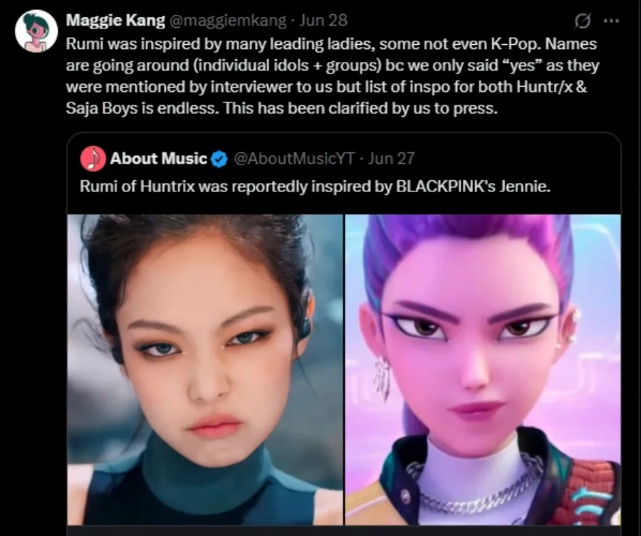 Following that revelation, numerous reports and social media posts began circulating, claiming that Jennie was the main inspiration behind the beloved fictional idol. Maggie Kang recently took to Twitter to clarify that Rumi was, in fact, inspired by many leading women in K-pop. “Names are going around (individual idols + groups) because we only said ‘yes’ as they were mentioned by interviewers to us, but the list of inspirations for both Huntr/x and the Saja Boys is endless. This has already been clarified to the press.”