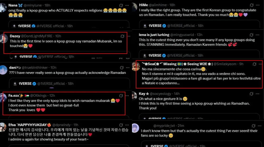 The post instantly went viral among K-pop fans, especially Muslims, who expressed their appreciation for the surprise greeting. Many pointed out that this was the first time they had seen a K-pop group acknowledge Islam and one of its practices. Others thanked 1VERSE for their thoughtful gesture on social media and hoped that other idol groups would follow suit in the future, given how overwhelmingly positive the response has been.