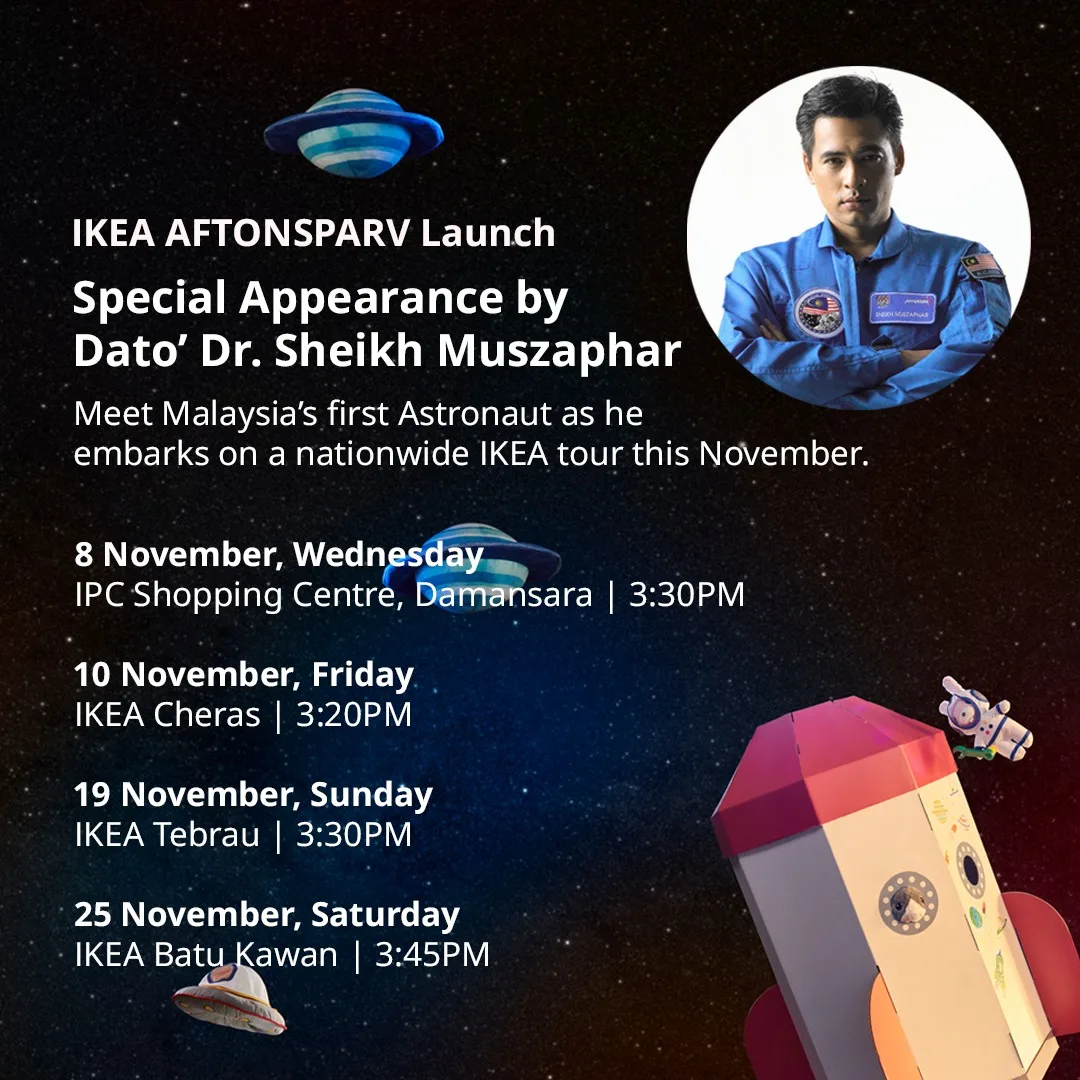 Come help launch the new IKEA space-themed AFTONSPARV collection at IKEA’s Klang Valley outlets! Not only are space-tastic activities awaiting you at IKEA, but you can also look forward to a special appearance by Malaysia’s first astronaut, Dato’ Dr. Sheikh Muszaphar! Click here to get all the details!