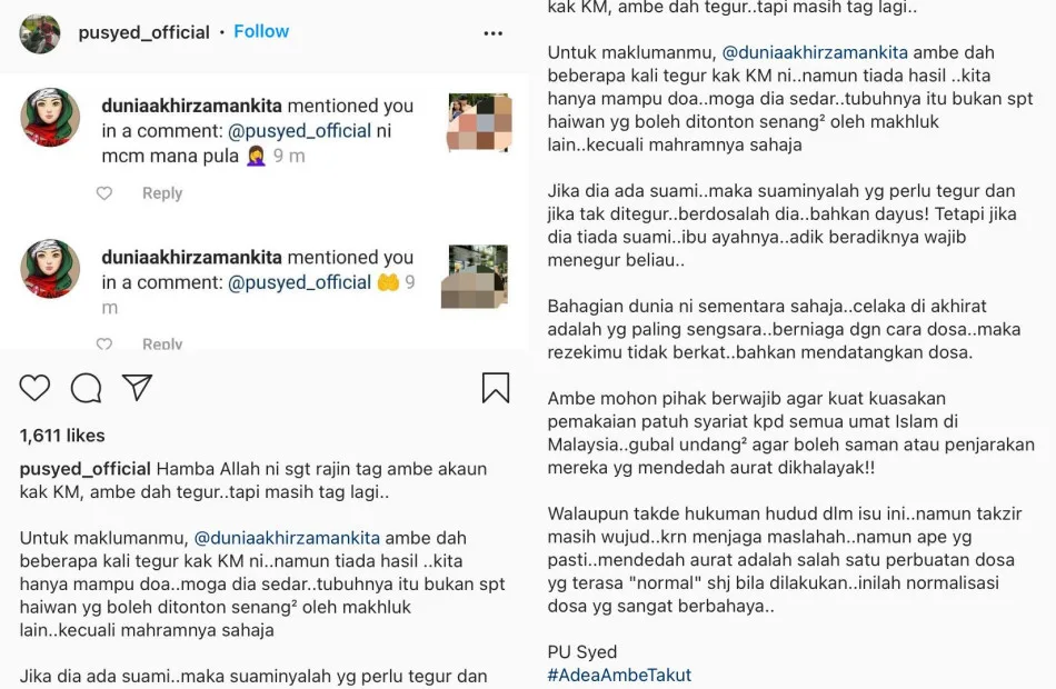 According to PU Syed, all of Kak KM’s hard work won’t be blessed if she conducts her business in a sinful manner. On top of that, the 39-year-old had also called for the authorities to enforce a Shariah-compliant dress code to all Malaysian Muslims.
