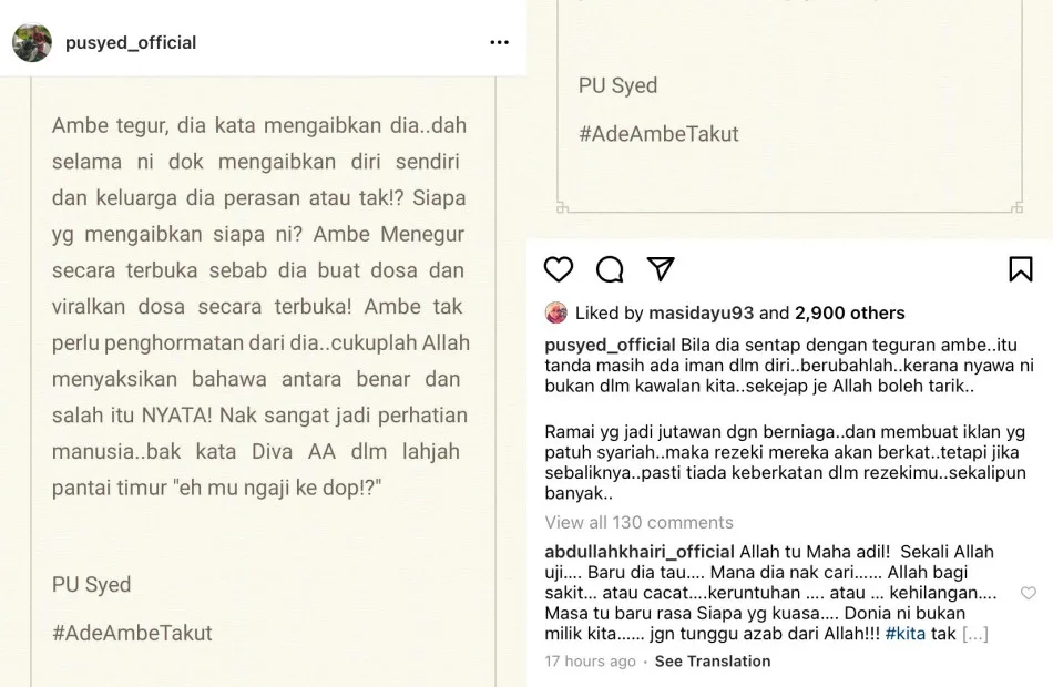 Muslim preacher Syed Mohd. Bakri Al-yahya (famously known as PU Syed) was recently asked by one of his followers on Instagram to share his thoughts on local entrepreneur Liana Rosli’s provocative marketing strategy on her social media postings.