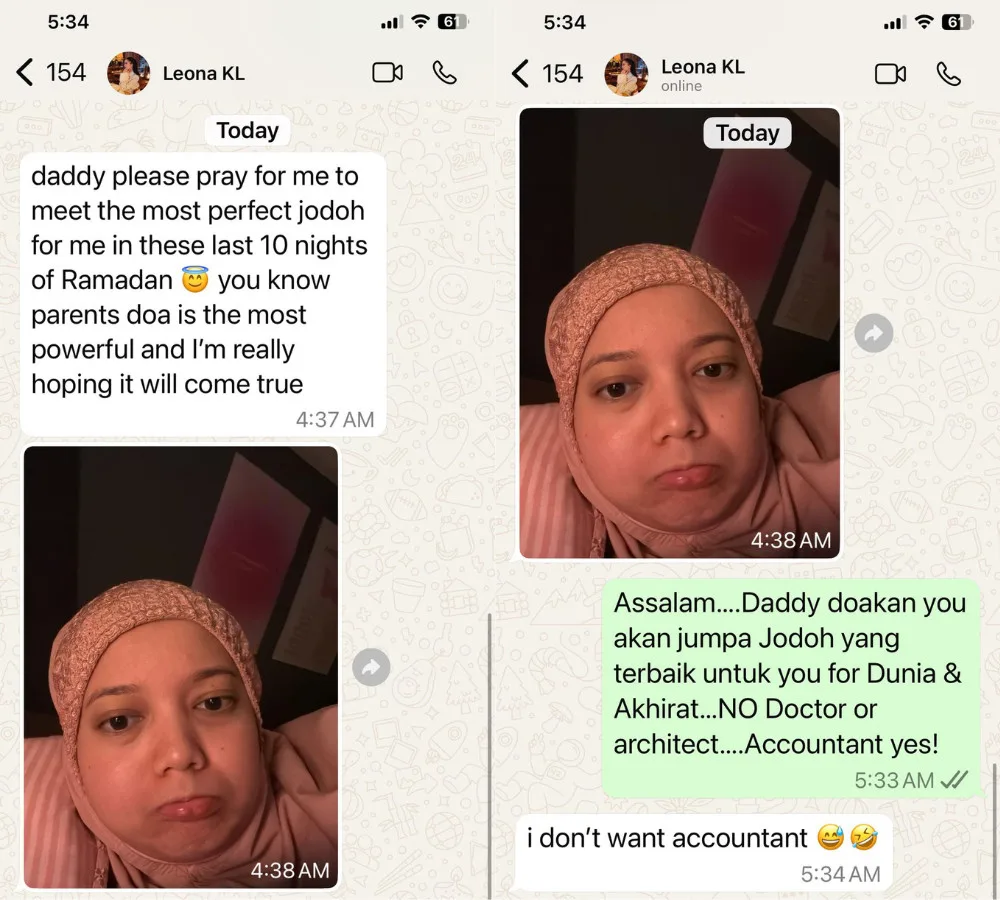 Actor Azhar Sulaiman recently shared a conversation with his daughter Leona on WhatsApp. As shown in the screenshot, the influencer asked her father to pray for her during the last ten days of Ramadan to meet the perfect partner. Leona continued, saying that a parent’s prayer is the most powerful, so she hoped Azhar could help her find the love of her life. She also sent a selfie of her pouting, seeming to try to get on her dad’s good side.