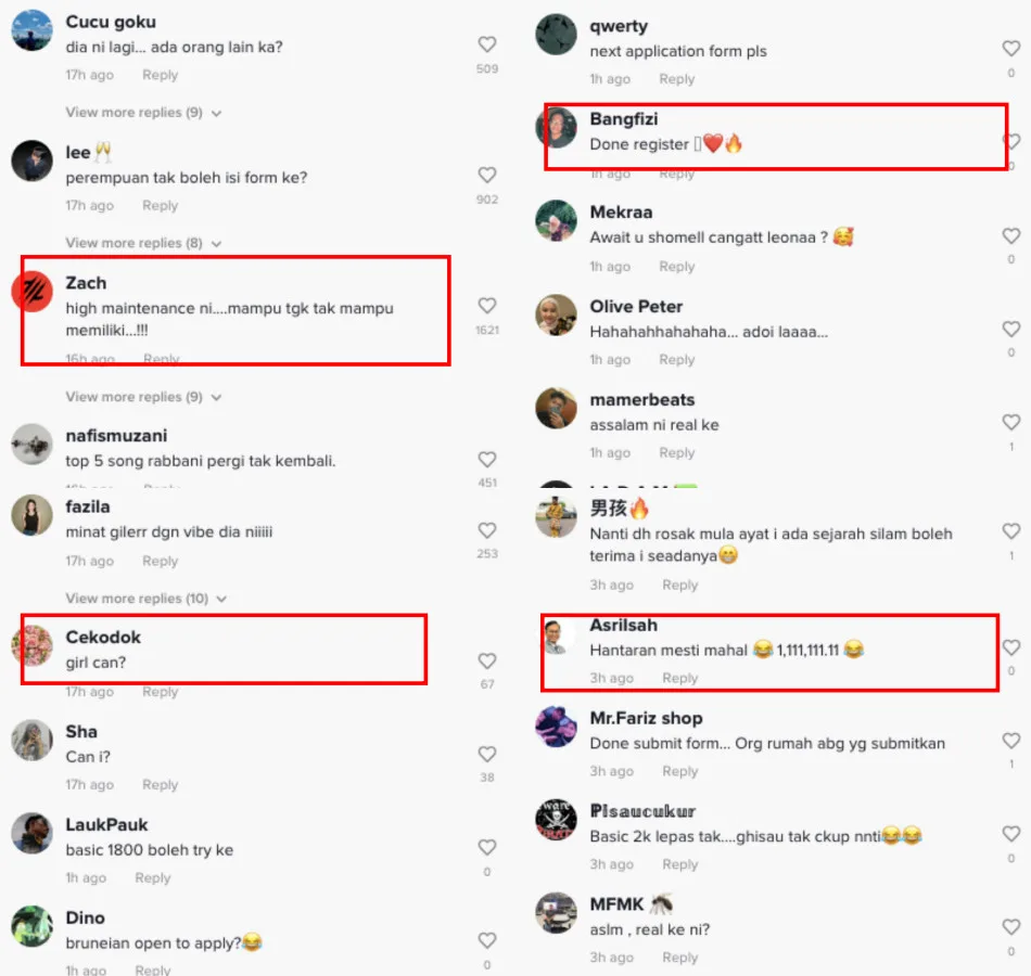 The Malaysian celeb then clarified that she did not prepare the application form herself as it was taken from another TikTok channel. After opening her application, many netizens (male and female) commented that they were interested in trying out. A few even accused Kasih Iris Leona of being too “high maintenance” for the things that were listed on the form.