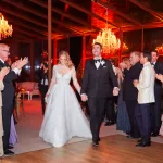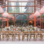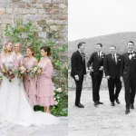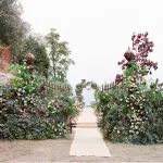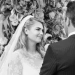 The happy couple exchanged their “I dos” in-front of close family and friends. The newlyweds were photographed between two Italian urns that were filled with pale pink roses. The hardwood floor at the wood fence also had petals, making it look like an idyllic vista.
