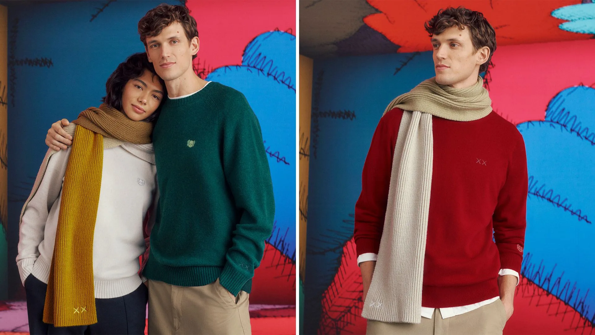 Most UNIQLO x KAWS collabs have lived in the graphic tee universe, but this collection takes things in a softer, cosier direction. Think cashmere, lambswool, and embroidered XX details that keep everything subtle yet unmistakably KAWS. The colour-blocking in red, green, and yellow adds festive flair without going full Christmas sweater mode, and even the HEATTECH beanies, gloves, and scarves carry his signature playfulness.