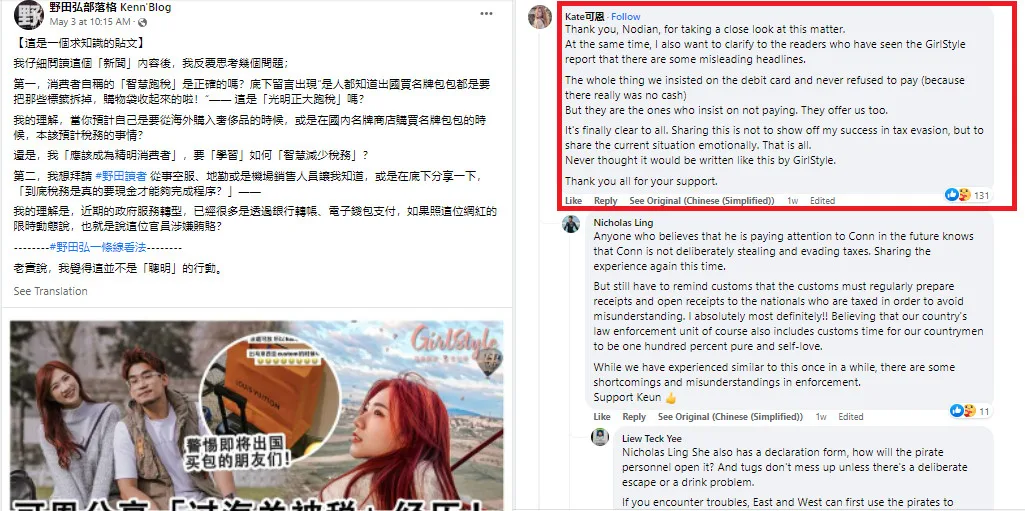 A well-known blogger, Kenn (野田弘部落格 Kenn’Blog) picked up the issue after media site GirlStyle reported on it. Kenn criticised the duo for bragging about avoiding paying the full tax amount. However, Kate replied to the post, clarifying that she was in no way trying to “show off (her) success in evading tax”. “We insisted on using the debit card for the whole (time) and did not refuse to pay (because we really had no cash),” she stated. “But they were the ones who (rejected) they payment. They were also the ones who offered us (the lowered tax price).”
