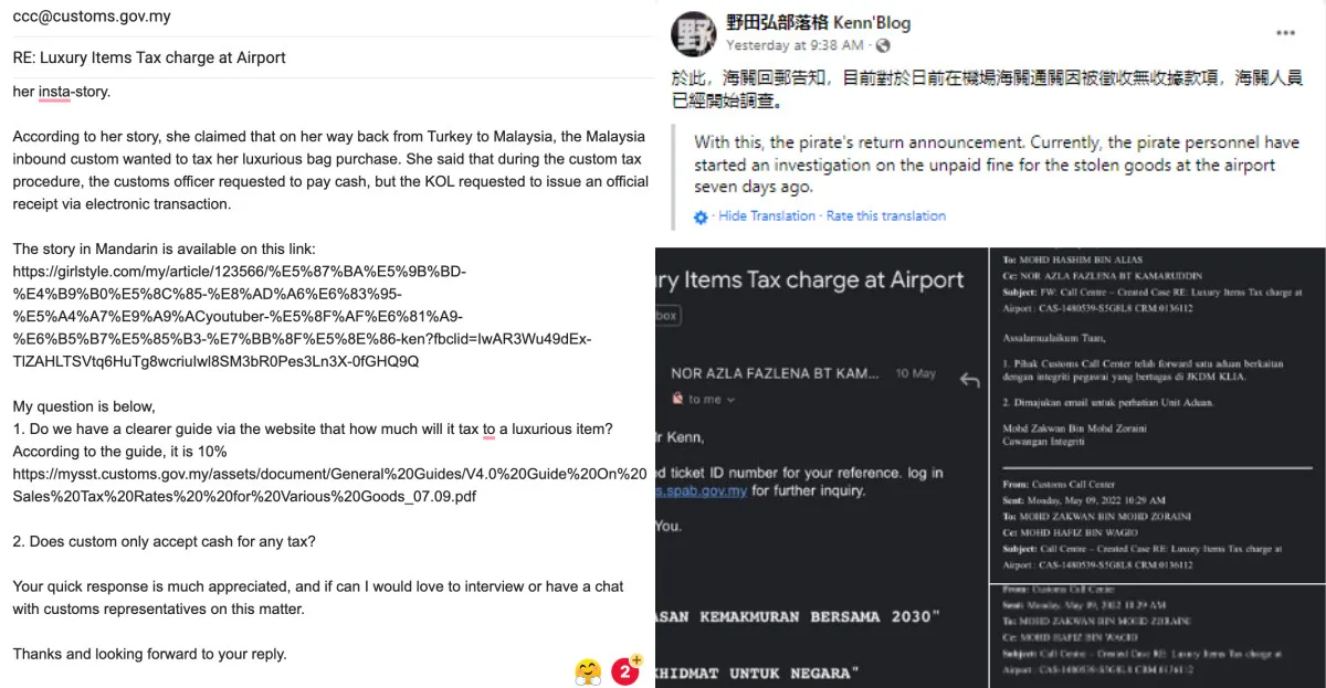 Kenn then reached out to the customs centre to inquire further about the matter. He directed two questions to them. First, how much is the tax for a luxurious item and second, does custom only accept cash for any tax. The blogger announced yesterday (11th May) that he received a reply. “Currently, customs officers have begun to investigate the custom clearance at the airport from a few days ago, due to being levied without receipts,” he stated.