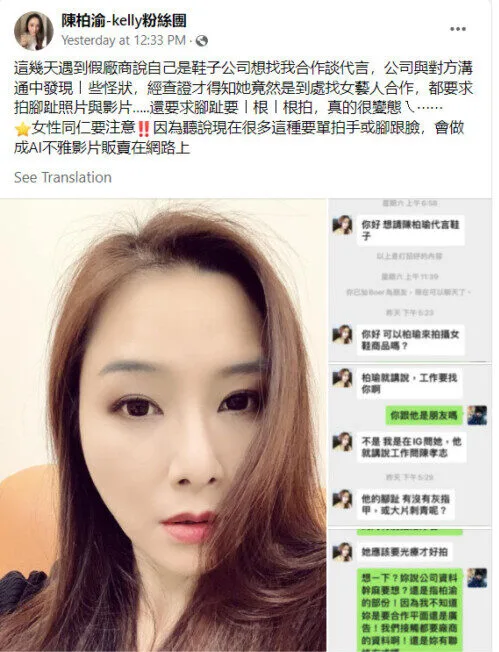 Kelly took to Facebook yesterday (28th February) to warn others of her experience. “Females should pay attention!” she stated. “I heard there are many people who want (photos of hands and feet), (they) will make indecent videos using AI to sell on the internet.”