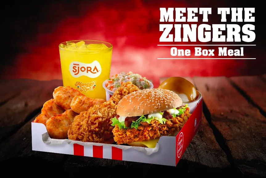 To enjoy great savings, the One Box Meal starts from RM19.90 for a full meal consisting of a Zinger burger of your choice, original or hot & spicy chicken, 4 piece nuggets, coleslaw, whipped potato, and Sjora Mangga Ria.