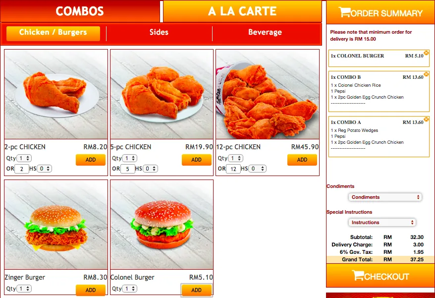 After which, you’re free to order away from their online menu, which comprises of both combos (promotions, individual, and family) and a la carte (chicken/burgers, sides, beverage) items. Add them to your list, then check if you need have any special requests e.g. more chilli sachets, more tomato sachets, change (money) instructions for delivery person. Then, you’re good to go!