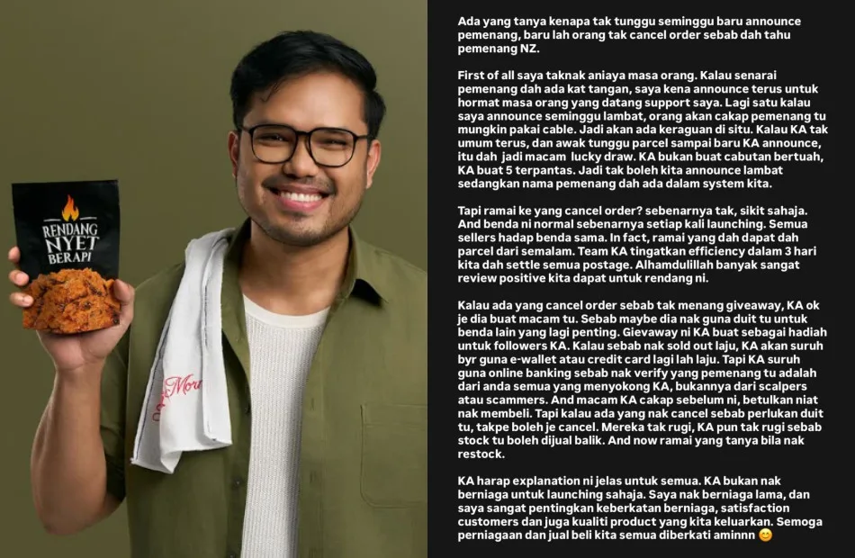 Yesterday (Monday, 11 August), Khairul Aming posted on Threads to address events following the launch livestream on TikTok. Regarding his decision not to wait a week to announce the winners, which would have prevented order cancellations, the entrepreneur explained that he did not want to deceive people, as that is not how he has conducted his business.