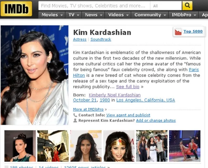 It appears that either the writers at IMDb are just a bit too honest or there’s a “Kim hater” at works. Just a few hours ago, Kim’s bio page read: