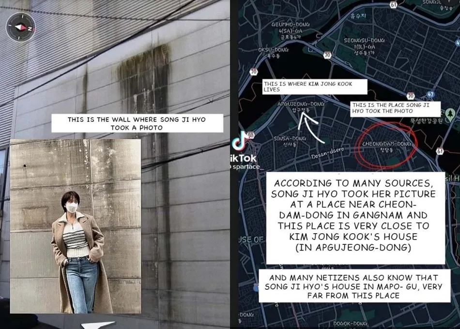 Back on 26th February, the “Intruder” actress shared with her fans a series of her stunning OOTD shots on her Instagram. As revealed on the TikTok page @spartace_, the wall where Ji Hyo took her photos was located in Cheongdam-dong, which is very close to Jong Kook’s house in Apgujeong-dong. Whereas, the fan pointed out that her house is in Mapo-Gu, which is very far from this place.