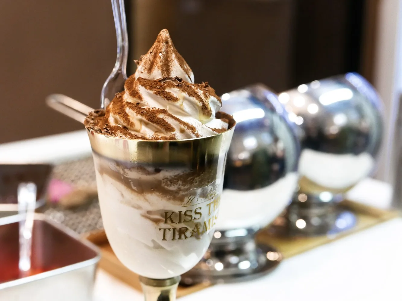 Filled with layers of ingredients, each serving comes with Mascarpone cheese at the bottom, soft-serve ice cream, crushed cookies, coffee liquor, cocoa powder, more Mascarpone cheese, more soft-serve ice cream, more cocoa powder, and finally topped with grated chocolate shavings.
