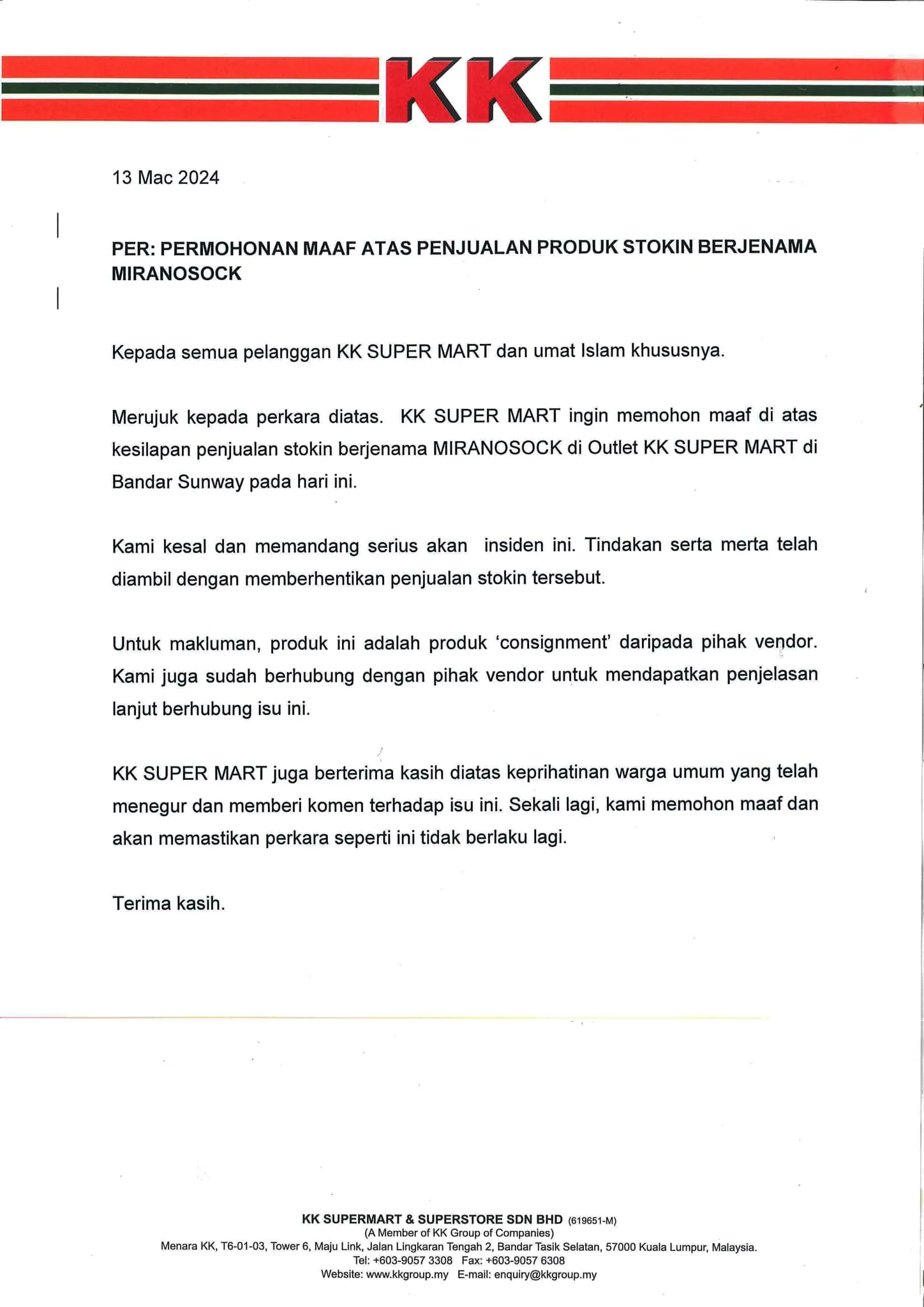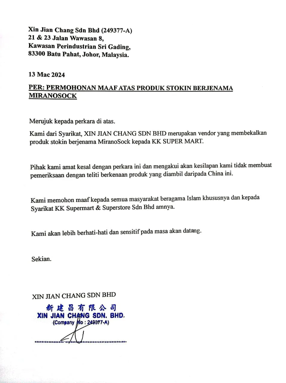 Following Firdaus’ post, KK Super Mart issued a statement regarding the sock. In their statement, the company apologised for the sales of the socks, saying they would look into the issue. KK Super Mart explained that the socks are a ‘consignment’ product from one of their vendors, but they have since taken the product off the shelves. The vendor, Xin Jiang Chang Sdn Bhd, has also apologised for the product, saying they were unaware of the print.