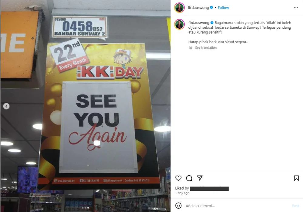 The ordeal started when Firdaus Wong posted a pair of socks he found in a convenience store in Sunway City. The socks were white but had the words Allah and the Arabic script of the word written on the sock. While the public figure never directly mentioned the store name, one of the images he shared confirmed that the store was a KK Super Mart outlet.