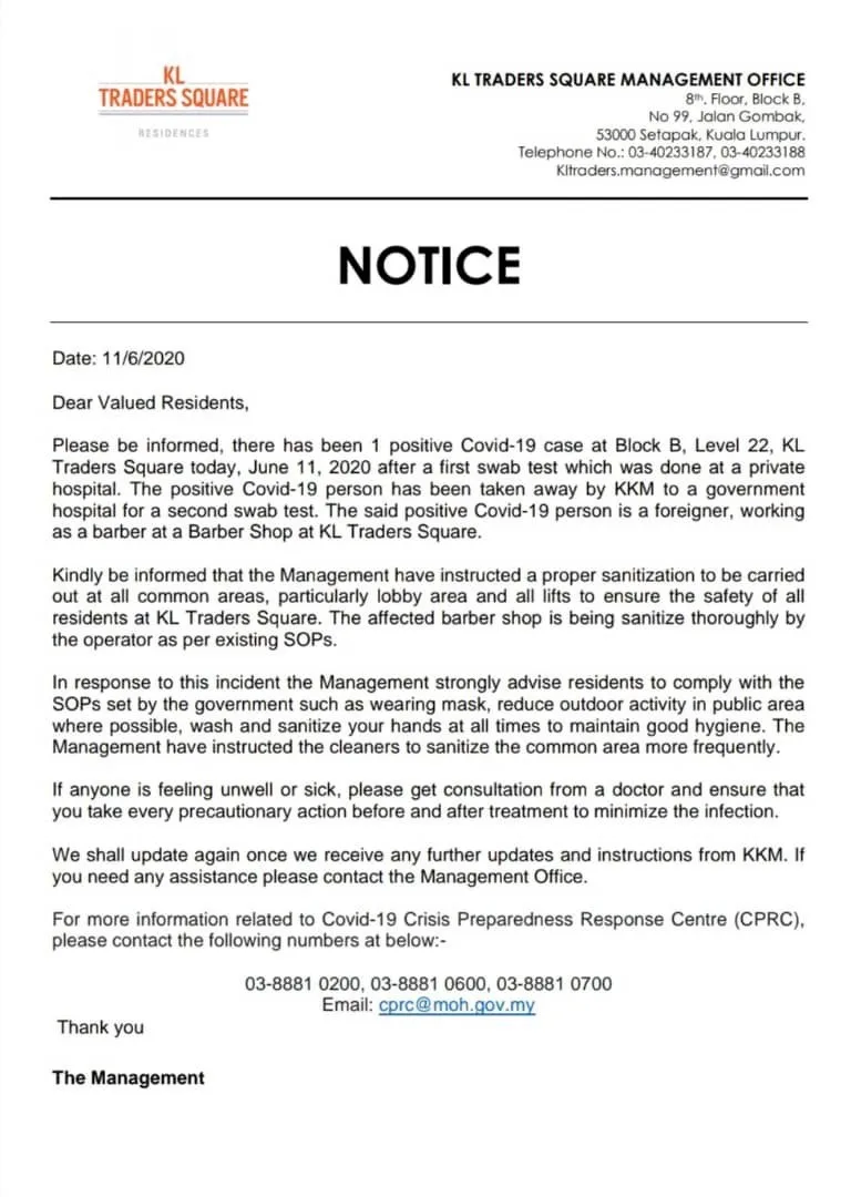 Attached below is the official notice from KL Trader’s Square and the confirmation from the Ministry of Health.