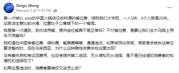 The complaint first popped up in Facebook group Malaysian Law Forum on 2nd February. Apparently, the customer hoped to seek legal advice regarding their situation. “It was the first time a hot pot restaurant in KL had charged a so-called cover fee. When we paid the bill, we discovered it was RM5 per person and RM20 for four people,” they said.