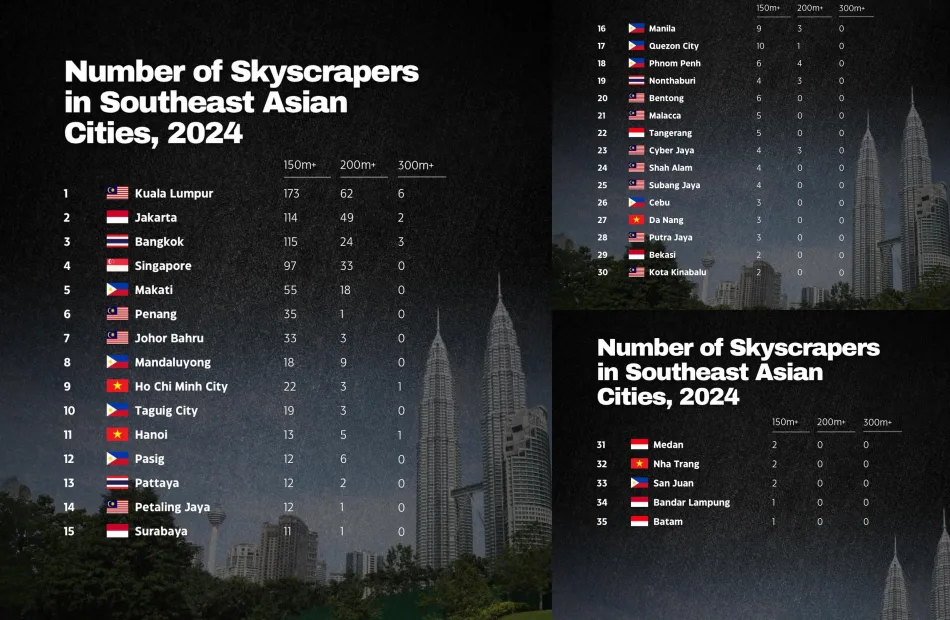 Just like in the previous data shared on Skyscraper Centre, there are 173 skyscrapers that are above 100 metres, 62 above 200 metres and 6 above 300 metres. Jakarta takes the number 2 spot with a total of 165 skyscrapers followed by Bangkok at number 3 with 142 skyscrapers.
