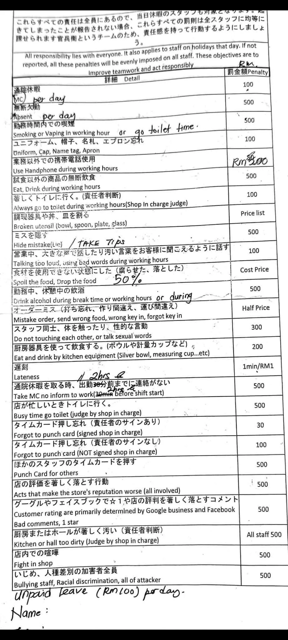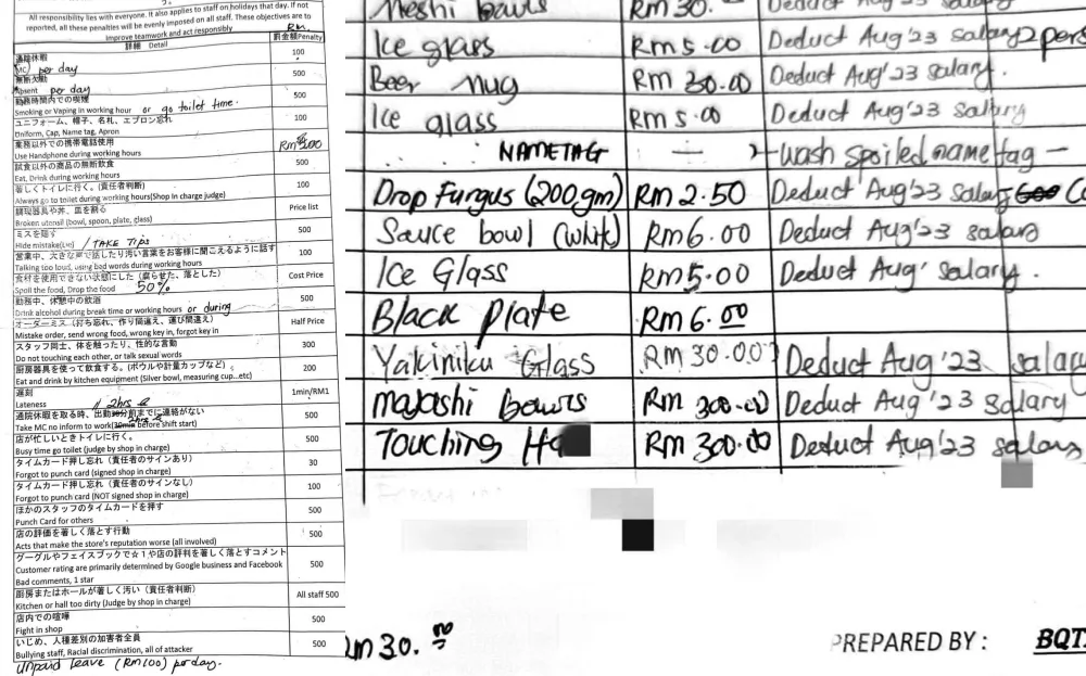 These fines comprised of matters like being late, taking MC without informing them before work, and consistently going to the toilet. Employees could lose up to RM500 for a single offense, and more as the shop fines RM100 per day for each day of unpaid leave.