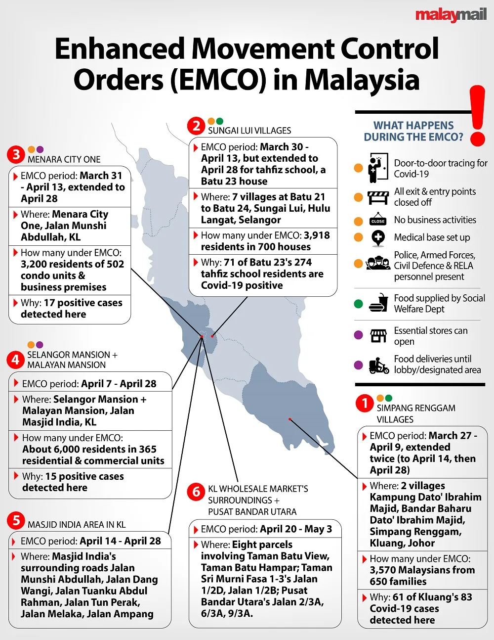 Malay Mail has also provided an infographic visual of all 6 EMCOs in Malaysia and 5 things that take place during the lockdown. Check it out: