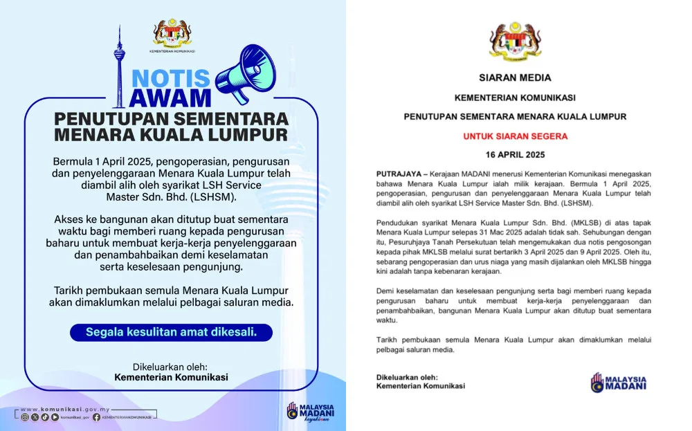 The closure of the iconic KL Tower is effective 17th April 2025. A statement from the Ministry of Communications revealed that the tower has been operating without government authorisation by Menara Kuala Lumpur Sdn Bhd (MKLSB) after the management was handed over to LSH Service Master Sdn Bhd on 1st April 2025 (Tuesday). It’s learned that the federal lands commissioner had issued two eviction notices to MKLSB earlier this month.