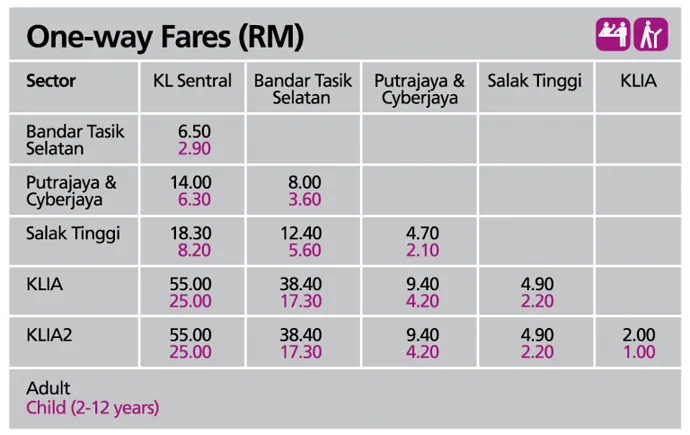 There’s also another option where you can travel from KL Sentral to Salak Tinggi, and then to KLIA/KLIA2. The total cost would come up to RM23.20. You can refer to the chart below and work out the math accordingly.