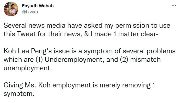 The Twitter netizen asked for change, beyond only helping Lee Peng. “Koh Lee Peng’s issue is a symptom of several problems, which are underemployment and mismatch unemployment,” he stated. “Giving Ms. Koh employment is merely removing one symptom.” Many others have offered to help Lee Peng first, but Fayadh remains adamant that there need to be a structural change to prevent such matters from happening again.