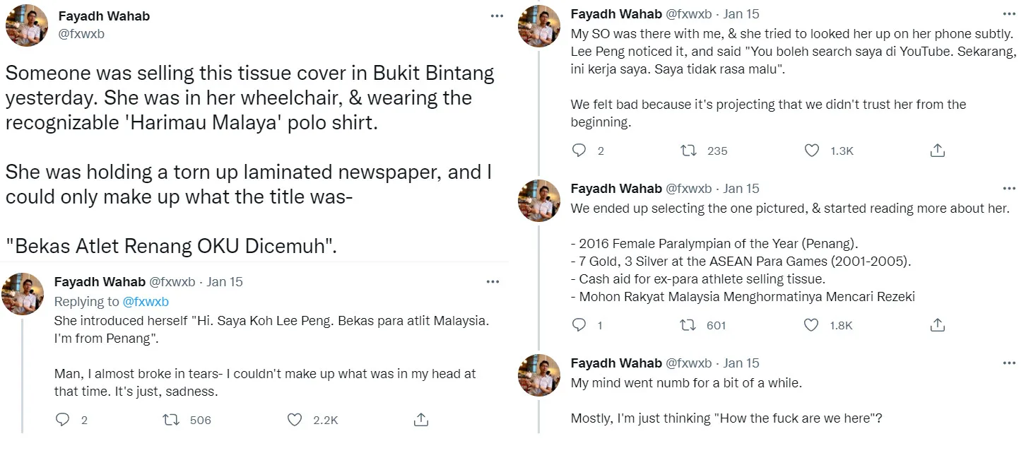 Although we hope most of them are well off after their dedication to the country, it seems that may not be the case. Recently, Twitter user Fayadh Wahab (@fxwxb) met an ex-para-athlete who is now selling tissue paper packets for a living. Fayadh was moved to bring attention to the matter via Twitter.