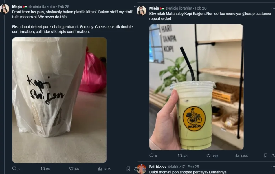“Perhaps it’s the same customer? How dare you do this to us? Do you feel happy with your ‘free’ matcha now? You even submitted a photo of our old cup design that we no longer use,” she wrote. In the previous thread, the employee claimed that a customer lied about receiving the wrong order from Kopi Saigon’s Shopee Food store and provided evidence by showing a photo of the latest cup design, checking the CCTV footage and even confirming the order details with the rider who delivered the item.