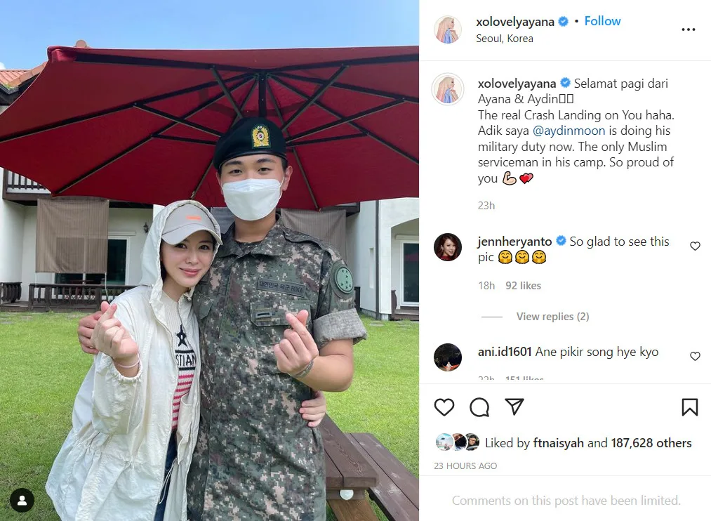 “Good morning from Ayana and Aydin. The real ‘Crash Landing On You’ haha. My brother @aydinmoon is doing his military duty now. The only Muslim serviceman in his camp. So proud of you 💪🏻💕” the 26-year-old captioned her post. As expected, the post was met with backlash from netizens online. Most of them condemned Ayana for not covering her aurat properly.
