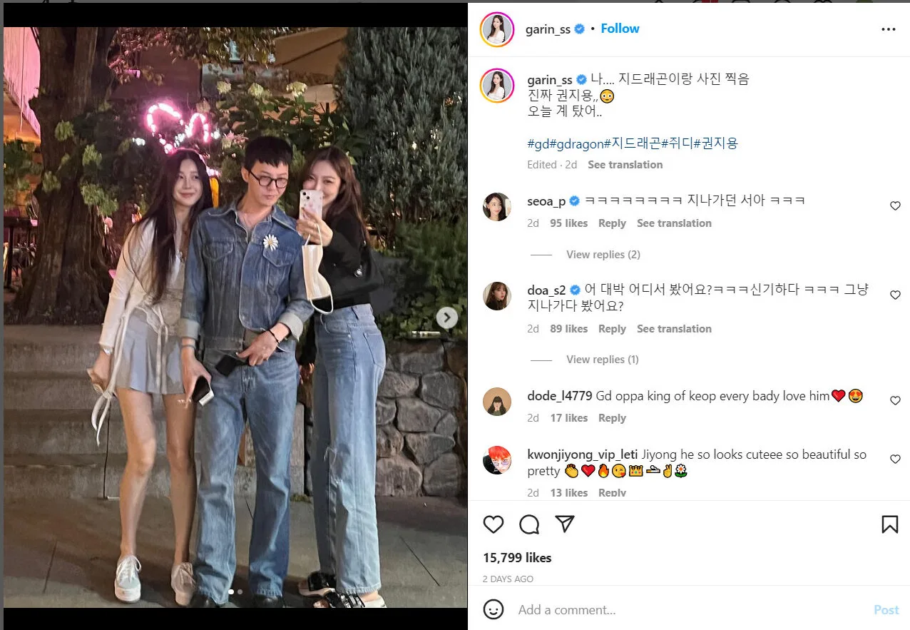 Speaking of which, Garin also confessed that she received malicious criticism from some netizens after she uploaded the pics online. According to her, “The chance of bumping into G-Dragon in Korea is already low. All we did was just take photos of people we don’t normally see in Apgujeong. So why should we get criticised? We are fans of him too.”
