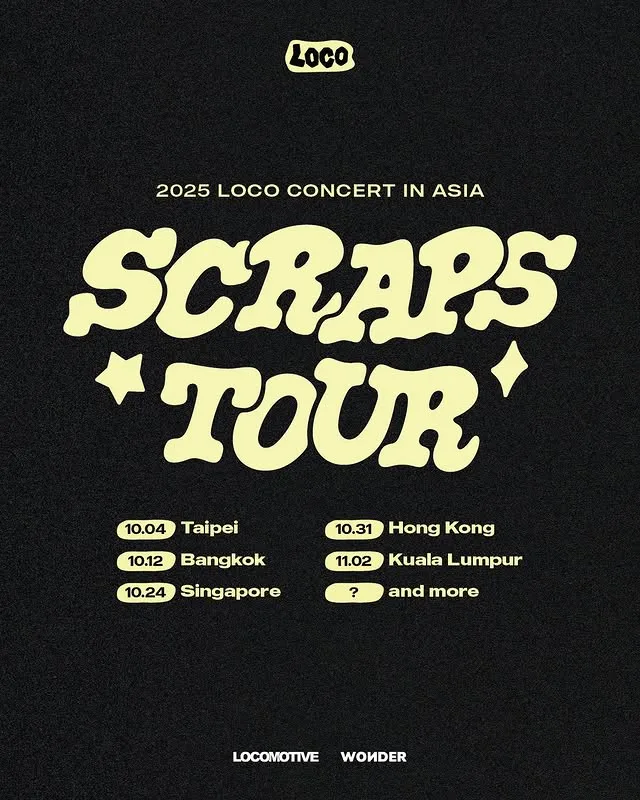 Yesterday (24th July 2025, Thursday), the rapper announced his new Asia tour, “SCRAPS”, in celebration of the release of his third studio album of the same name. As shown in the announcement poster, Loco will perform in several cities, including Taipei, Bangkok and Kuala Lumpur. His show in KL will take place on 2nd November 2025 (Sunday). More details on the show, including venue and seating plans, will be announced soon.