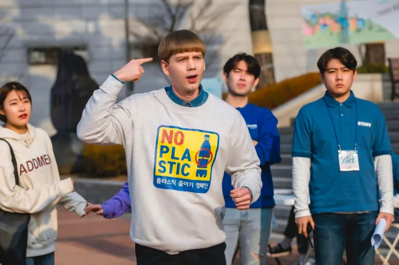 Han Hyun-min’s character also shares his name and is the same age as him. Han Hyun-min shared that his character “commutes from the city of Icheon and it takes five hours. That’s why he tries to stay at the dormitory. He’s a very pure and innocent soul.” As a Korean, he’s not able to stay at the international dormitory, but he sneaks his way in due to the difficult commute. Despite facing challenging and funny situations frequently, Hyun-min maintains his determination and positivity.