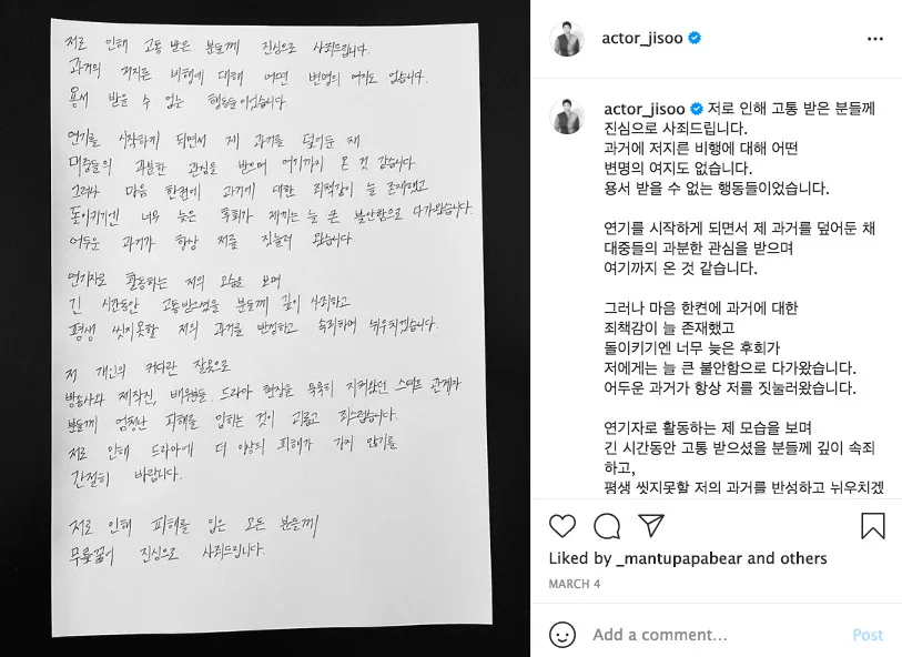 The most recent infamous case involves actor Kim Ji-Soo, who was just removed from his role in “River Where the Moon Rises” (달이 뜨는 강) due to bullying allegations and sexual harassment. He eventually admitted to those claims and apologised for his actions, and was condemned by many of his fans. Unsurprisingly, his role was replaced with actor Na In-Woo (나종찬).