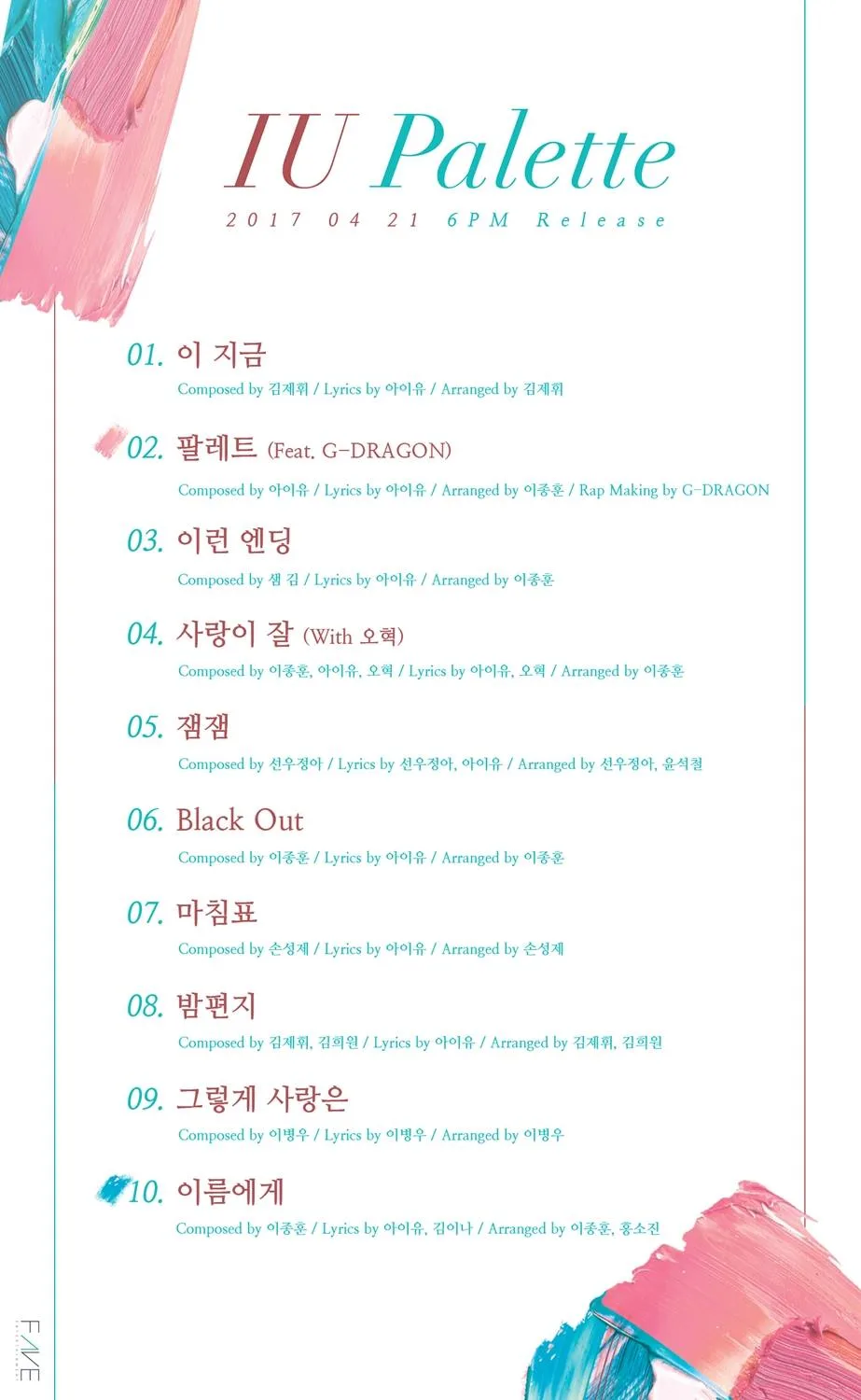 Aside from working together with G-Dragon, the album also saw another high profile collaboration between IU and Oh Hyuk of indie band Hyukoh. Made public on 7th April, “Can’t Love You Anymore (사랑이 잘)” was a pre-release track for “palette”.