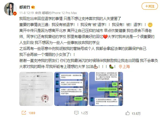 Du uploaded a post on Weibo yesterday (8th November) to address the issue. Her reason for doing so was mainly because she didn’t want to disappoint those supporting her. Du emphasised three times that she was not dropping out of university. “I did not drop out! I have not been “dropped out”! I did not! Drop out! Of school!” she exclaimed.
