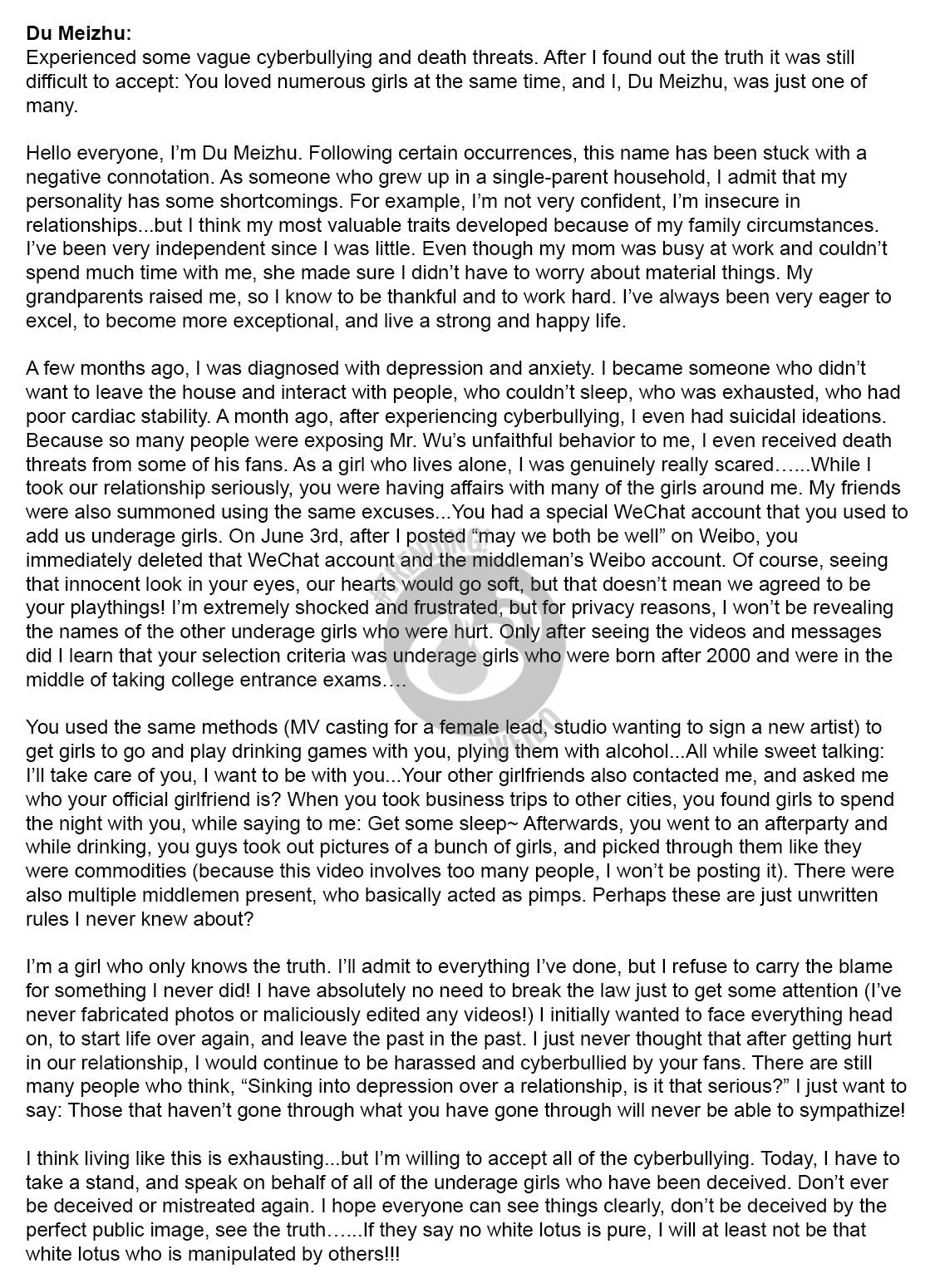 “When you travel to different cities for work, you would find other girls to stay the night with you. You still told me to sleep early. Afterwards, you went to an after party and while drinking, you guys took out pictures of a bunch of girls, and picked them out like merchandises. There were also multiple middle persons there, who basically acted like pimps. Perhaps these are just unwritten rules I never knew about?” Du questioned.