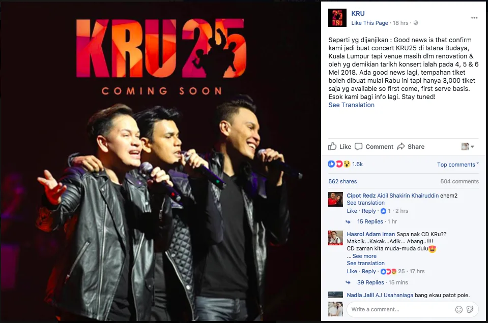 In an official statement posted up on the KRU Music Facebook page, KRU wrote, “It has been a longtime dream of KRU’s to hold a concert at the Istana Budaya thus we’ve been waiting for the right time to stage a concert that will allow us to share our journey.”