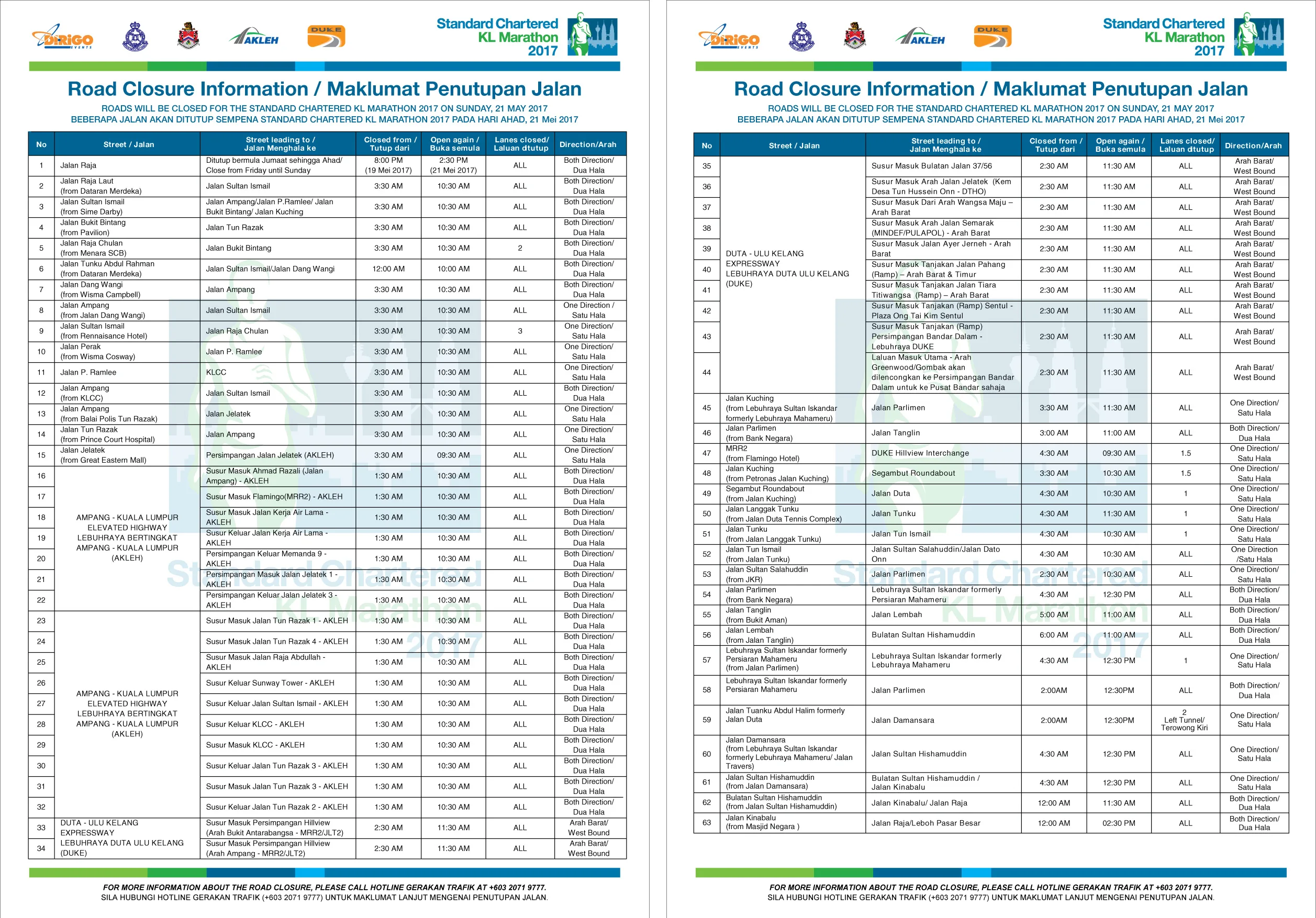 Selected roads around the city will be closed this Sunday (21st May) to make way for the Standard Chartered KL Marathon 2017 (SCKLM). Similar to last year, the main highways – Duta-Ulu Klang Expressway (DUKE) and Ampang-Kuala Lumpur Elevated Highway (AKLEH) – will be closed.