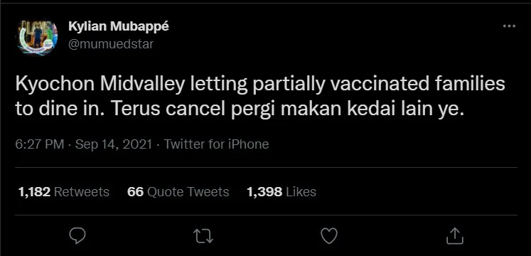 “Kyochon Mid Valley letting partially vaccinated families to dine in. Immediately canceled and went to another restaurant,” he wrote. Following that, Kyochon Malaysia responded to the Tweet to provide feedback on the complaint.