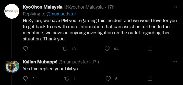 Kyochon Malaysia, through its official Twitter account, remarked that they have already sent a private message to Kylian to get more information regarding the issue. The famous Korean fast food outlet also remarked that they are conducting a detailed investigation into the branch.